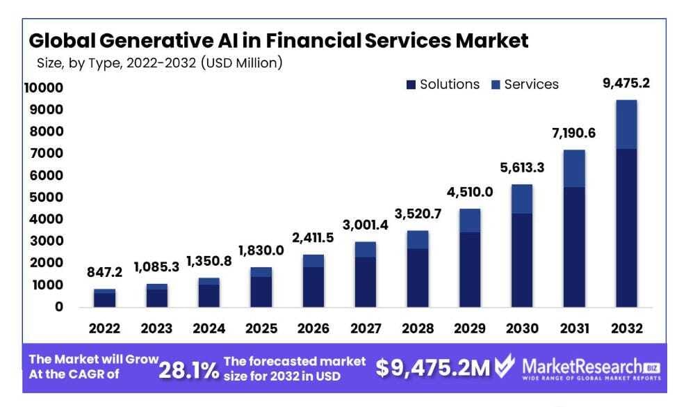 The financial services market for generative AI reached USD 847 million in 2022 and is expected to exceed USD 9.48 billion by 2032. That’s more than 10x growth over the next 10 or so years!