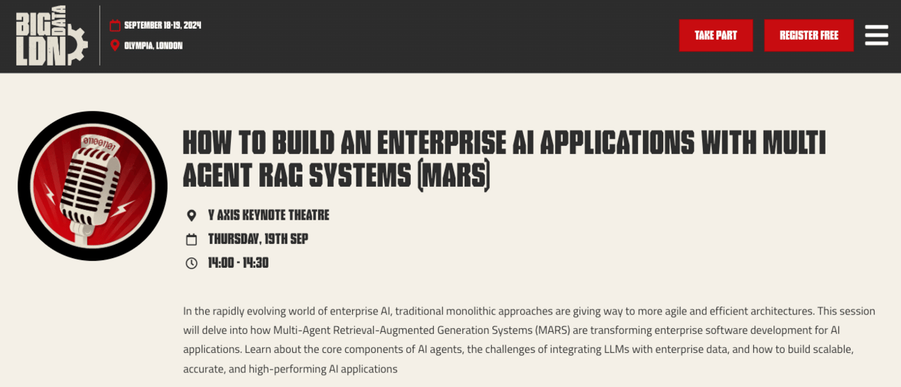 The first event is at Big Data London, where he’ll dive deep into “How to Build Enterprise AI Applications with Multi-Agent RAG Systems (MARS)”.
