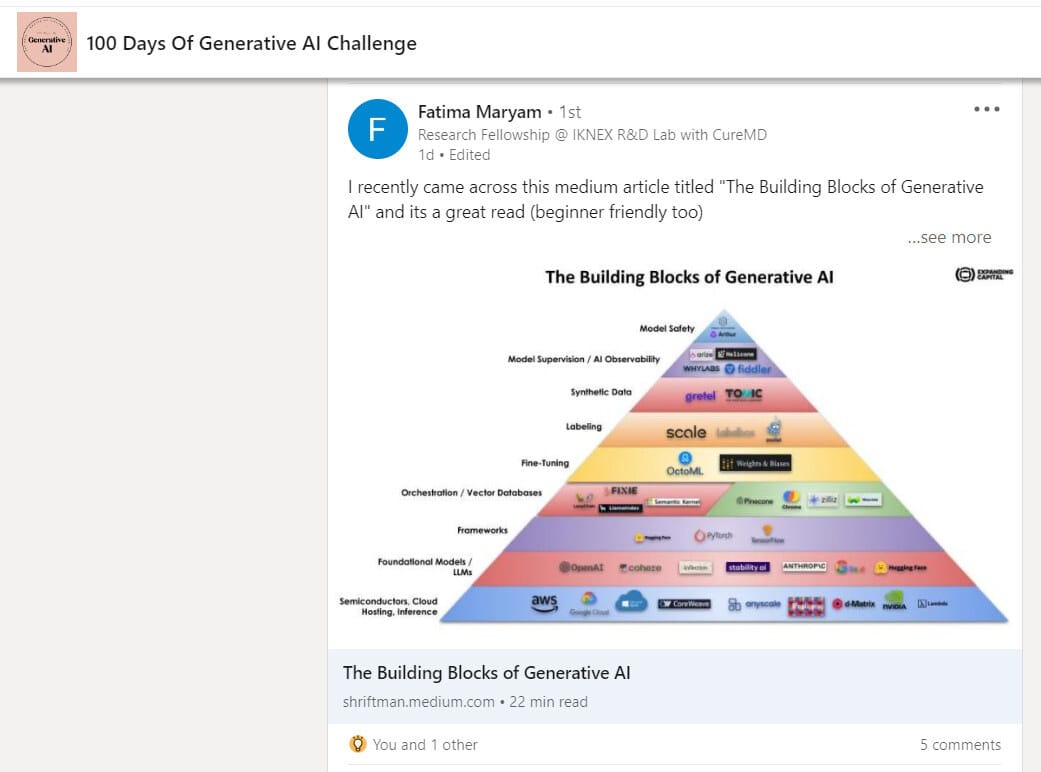 Big shout out to Fatima Maryam for sharing the building blocks article inside of our 100 Days To Generative AI learning community!